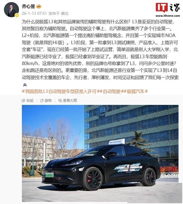 近日,北汽新能源极狐品牌在自动驾驶领域迈出重要一步,其用户运营中心副总经理乔心昱公开阐述了极狐L3与其他品牌辅助驾驶的核心差异。他明确指出,L3级属于真正意义上的自动驾驶,而其他技术目前仍停留在辅助驾驶范畴。